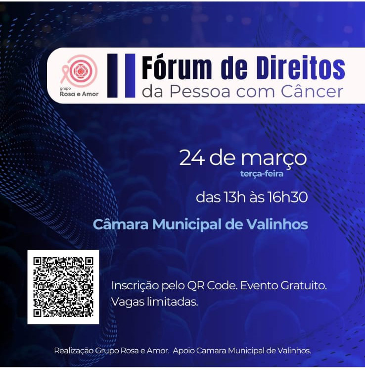 O Grupo Rosa e Amor realizará, na próxima terça-feira, 24 de março, às 13h30, no Plenário da Câmara Municipal, o II Fórum de Direitos da Pessoa com Câncer — um encontro voltado à ampliação do conhecimento e ao fortalecimento da cidadania.