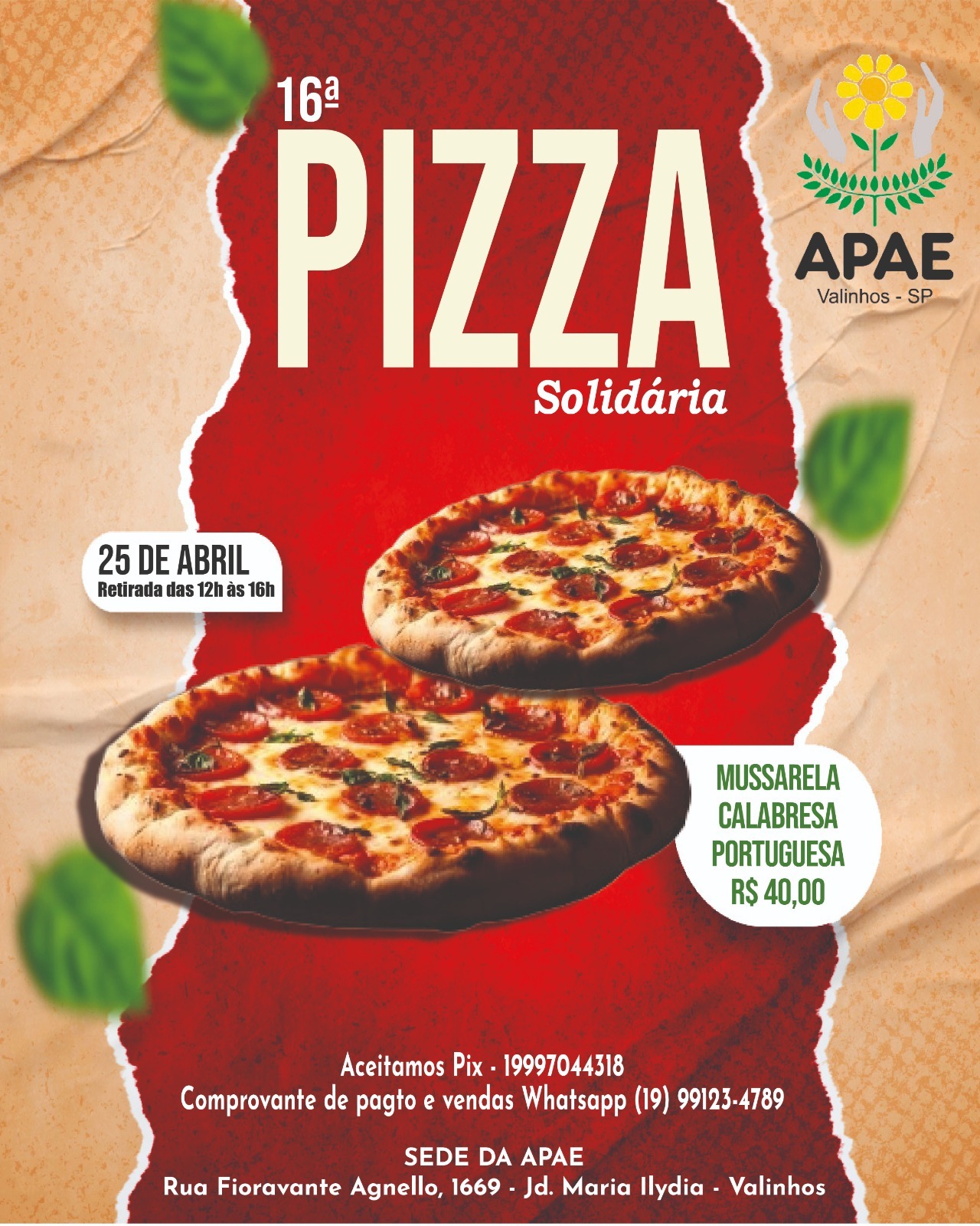 16ª edição da Pizza solidária da APAE ValinhosDia 25 de abril com três sabores a sua escolha!